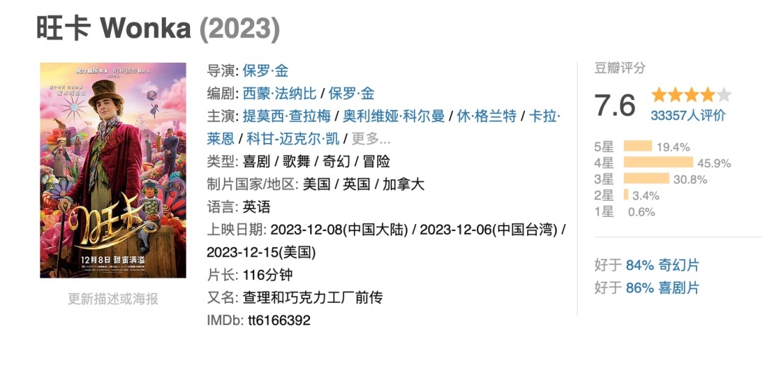当今《旺卡》豆瓣评分为7.6分,在本年繁密电影中算是中上水平。